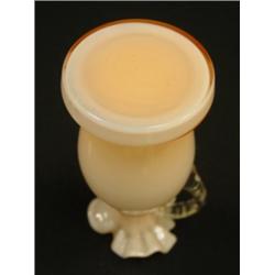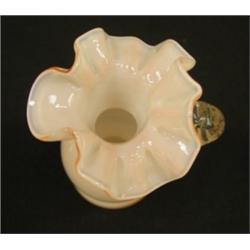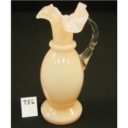 FENTON Rose Overlay handled jug. Clear crimped handle and ruffled rim. No. 355. Circa 1945. 8.5" tall. Condition: Excellent
