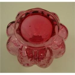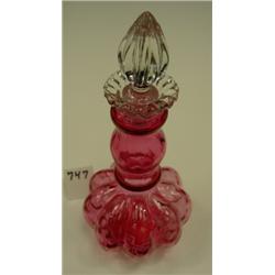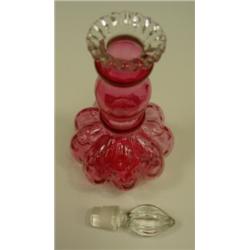 FENTON Ruby Overlay 9" cologne bottle with original stopper. Knopped neck, melon base, clear glass rim. Condition: Excellent