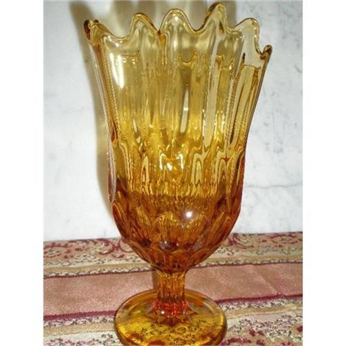 WE PRESENT TO YOU A FENTON TALL AMBER COLORED VASE, SHOWING A BEAUTIFUL FLUTED PEDESTAL BASE WITH A FLARED CYLINDRICAL BODY, MOVING UP TO A SIMPLE RUFFLED RIM. THIS VASE IS A LITTLE MORE RARE BEING AMBER AND WONT LAST LONG AT THIS PRICE. OH, ITS ALSO IN PRISTINE CONDITION. JUST AS THE TALL BUD VASE AND A SIMILAR STYLE.