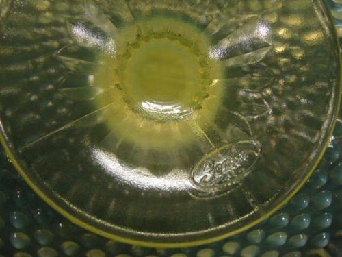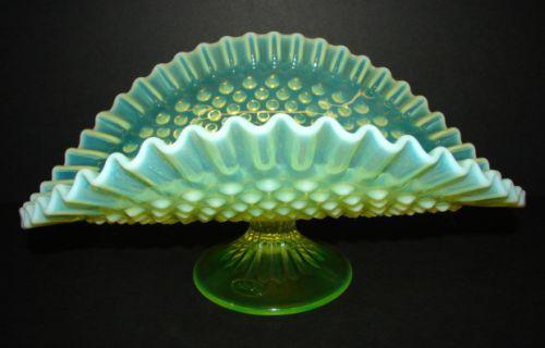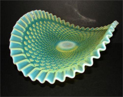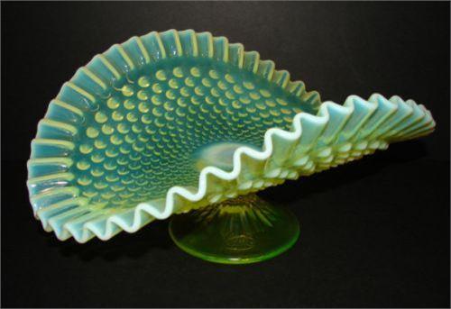 FENTON OPALESCENT VASELINE GLASS BANANA BOWL. Hobnailed pattern. Ruffled edge. Marked with mouled Fenton mark at base. 5.5” H, 12.25” L