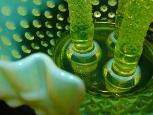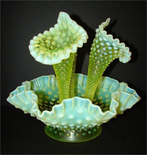FENTON OPALESCENT VASELINE GLASS EPERGNE. Hobnailed pattern. Ruffled edges. Marked at base with moulded Fenton mark. Excellent condition. 9” H