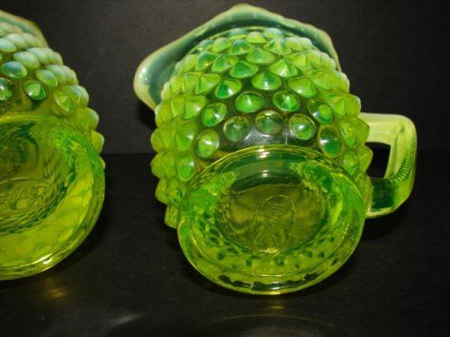 FENTON OPALESCENT VASELINE GLASS COVERED SUGAR & CREAMER. Hobnailed pattern. Both are marked on bottom with mouled Fenton marks. Sugar: 5.5” H to top of finial. Creamer: 4” H