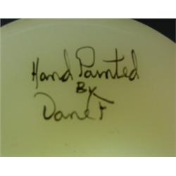 Fenton yellow handpainted vase with ruffled edge. Wishing well with rooster. 6-1/2" tall and 4" wide. Signed "Dane". Condition: Excellent