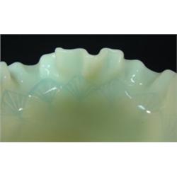 Fenton yellow opaline pedestal compote in "Fan" pattern. Marked with small mark. Opalescent fans inside edge of bowl. 6" tall and 6" wide. Condition: Excellent