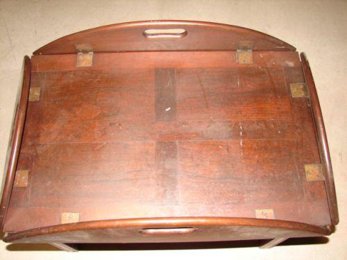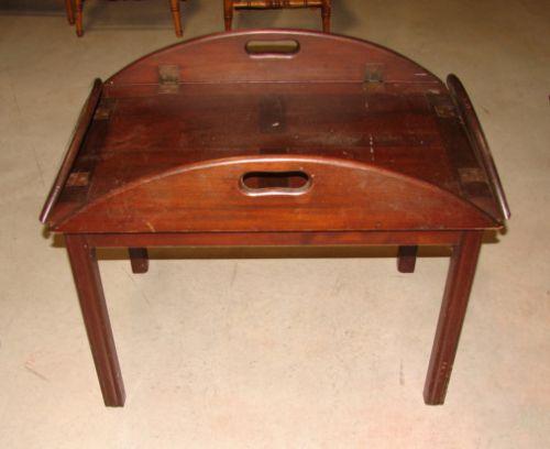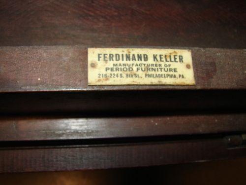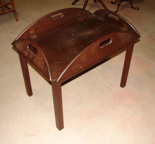 FERDINAND KELLER, PHILADELPHIA, PENNSYLVANIA CHIPPENDALE STYLE MAHOGANY BUTLER’S TABLE. Marked with tag on underside of top. 24” H (with sides up), 36.5” L (with sides extended) , 28” W (with sides extended).