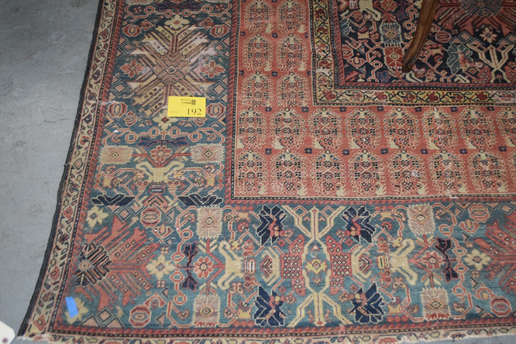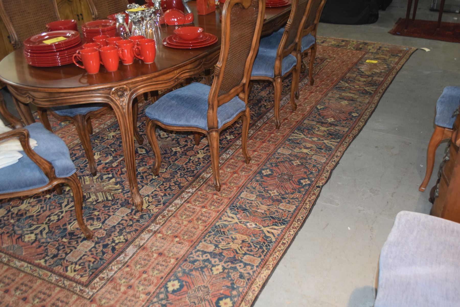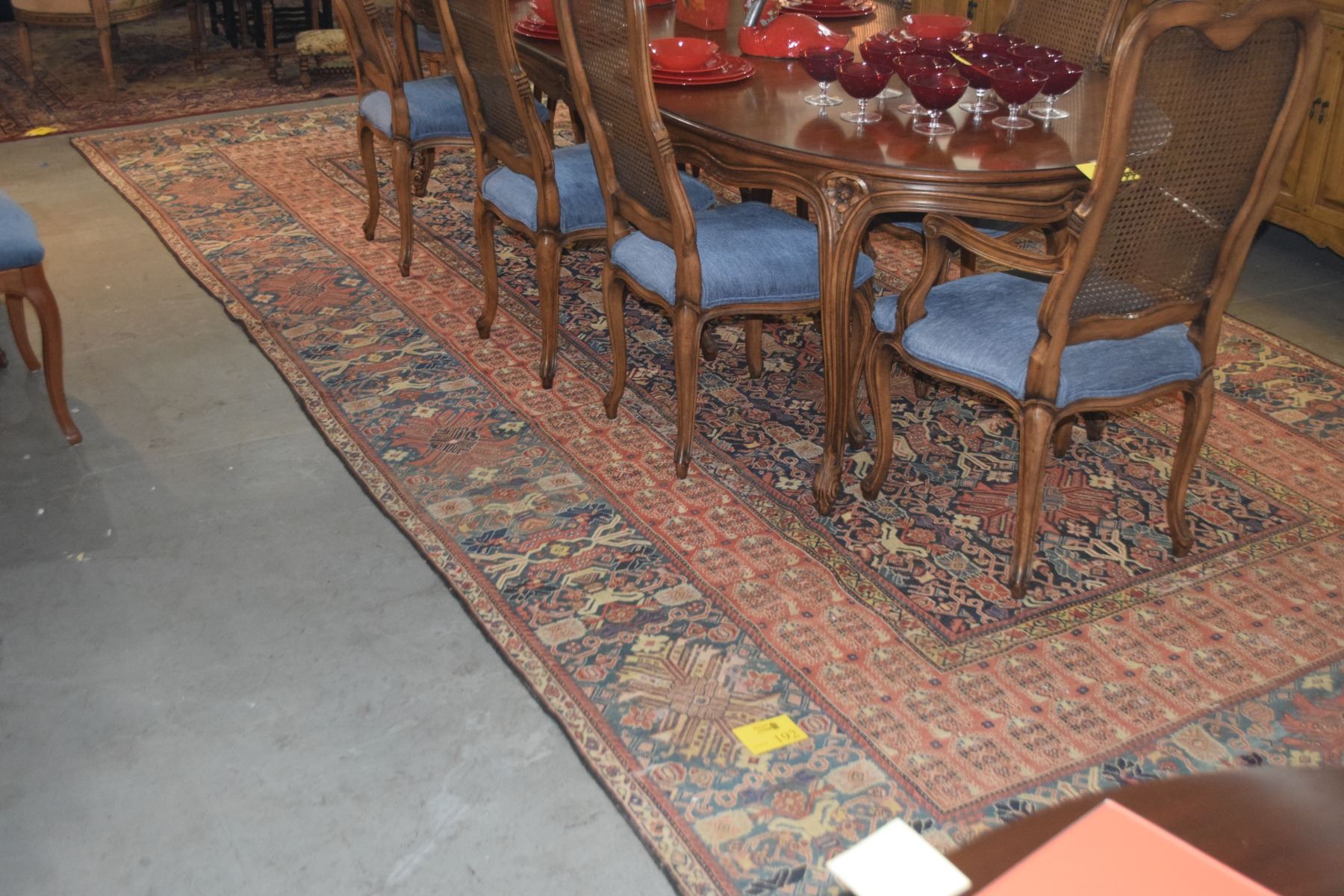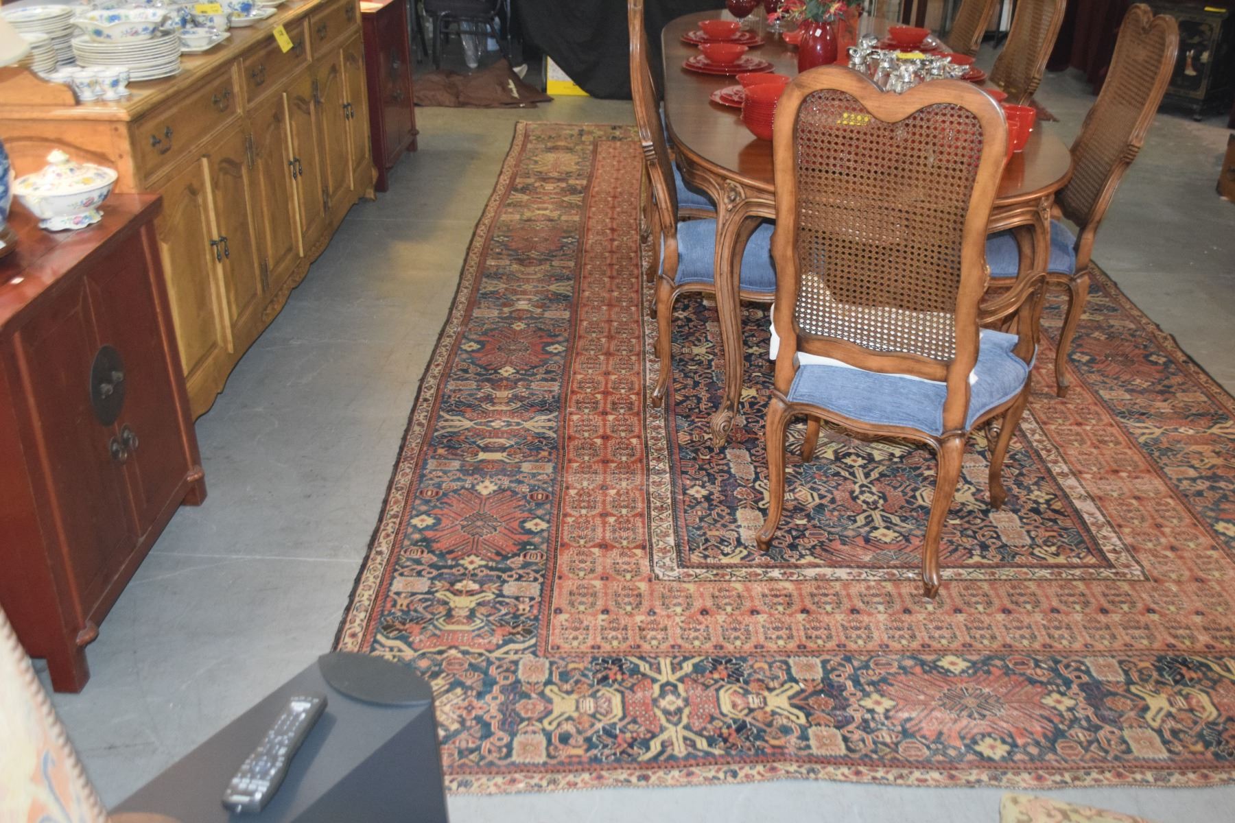 FEREGHAN HAND KNOTTED WOOL PILE CARPET, THE DEEP BLUE FIELD W/GEOMETRIC FLORAL PATTERNS IN ROSE RED, BLUE & WHITE, SURROUNDED BY BORDERS W/BOTEH & FLORAL DESIGNS, IRANIAN CA. 1900 (8' X 16')