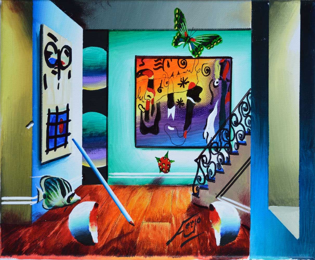 FERJO ** MAGNIFICENT MIROS ** SIGNED ORIGINAL . Artist: Ferjo (b. 1946) - Title: Magnificent Miros - Medium: Original Acrylic on Canvas - Signature: This one-of-a-kind work is hand-signed by the artist at the bottom of the image - Image Size: Approximately 9 inches x 12 inches - Framed: Stretched and Ready for Framing - Details: This work comes with a Certificate of Authenticity - Biography: Ferjo (b. 1946 - Fernando de Jesus Oliveira) is Brazilian, but lives in the U.S. now. A master of many different styles, he has become known for his work in surrealism. Dali and Magritte would be proud of this follower of theirs. Whether he is painting a room interior, complete with floating objects, or a marina scene his use of colors and lines is flawless. - Ferjo originals have sold for more than $100,000.00.