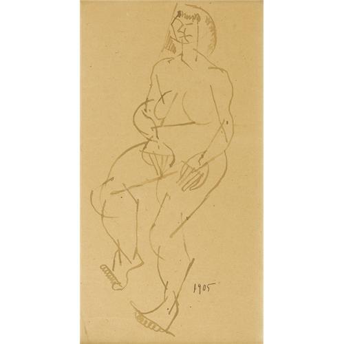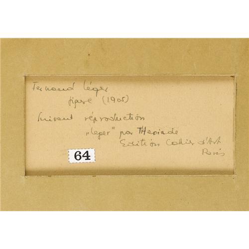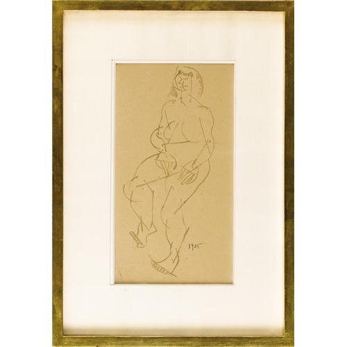 <B>FERNAND LEGER</B></I> (French 1881-1955)<BR><I>Standing Figure,</B></I> 1905<BR>Pen drawing on paper<BR>13 x 7 inches, sight (33 x 17.8 cm)<BR>Dated lower right: <I>1905</B></I><BR>Inscribed verso: <I>Ferdinand Leger / figure (1905) / Suivant reproduction / "Leger" par Theriade / Edition Cahier d'Art / Paris</B></I><BR>Collection stamp verso<BR><BR>Provenance:<BR>The collection of Ladislas Szeecsi, Paris (also known as Ladislas Segy);<BR>The collection of Mrs. Henry (Ethel) Epstein, acquired in New York City, 1931, Armory Auction ?;<BR>By descent to present owners<BR><BR> <B>Condition Report:</B> In original condition, one very minor crease in the paper at lower left corner<BR><BR><b>Shipping:</b> Requires 3rd Party Shipping (<a target="_blank" href="http://www.heritageauctions.com/common/shipping.php">view shipping information</a>)