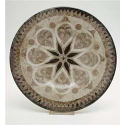 Keramik. Heller Scherben mit weißer Überlaufglasur und farbiger Bemalung in mehrtonigem Grau, Beige und Schwarzblau. Sternblumenartiges Dekor, von umlaufendem Zackenband auf dem Fahnenrand gerahmt. Runde flache, schwach gemuldete Form auf Standring. Unter dem Stand min. best. Ø 26 cm. Bez.: Künstlersignatur (braun gemalt), Klebeetikett, 3. Um 1907 Lit.: Duncan, Alastair, The Paris Salons 1895-1914, Volume IV: Ceramics and Glass, London 1998, Abb. S. 372 (Dekorvariante)