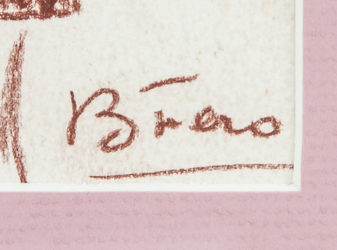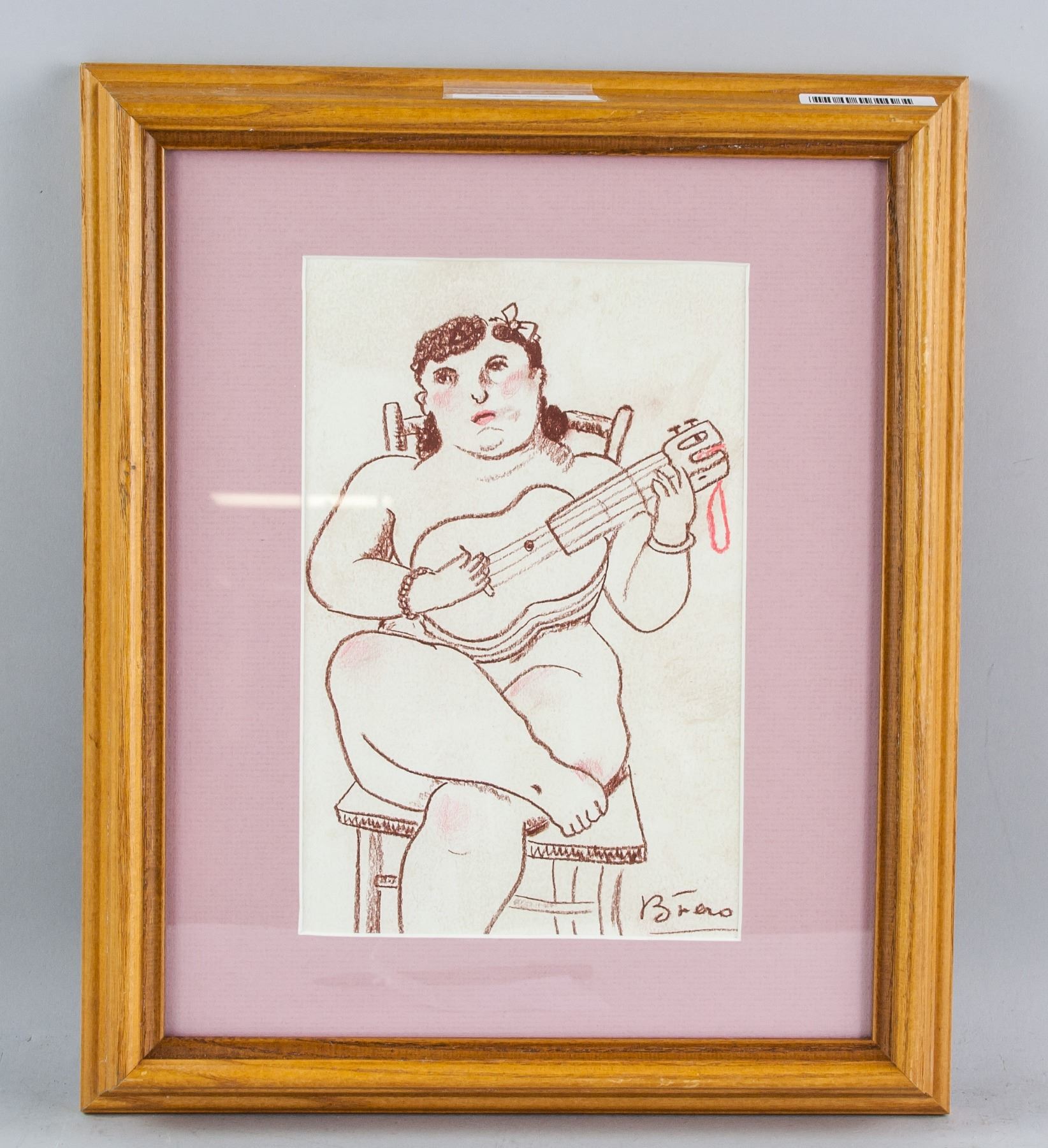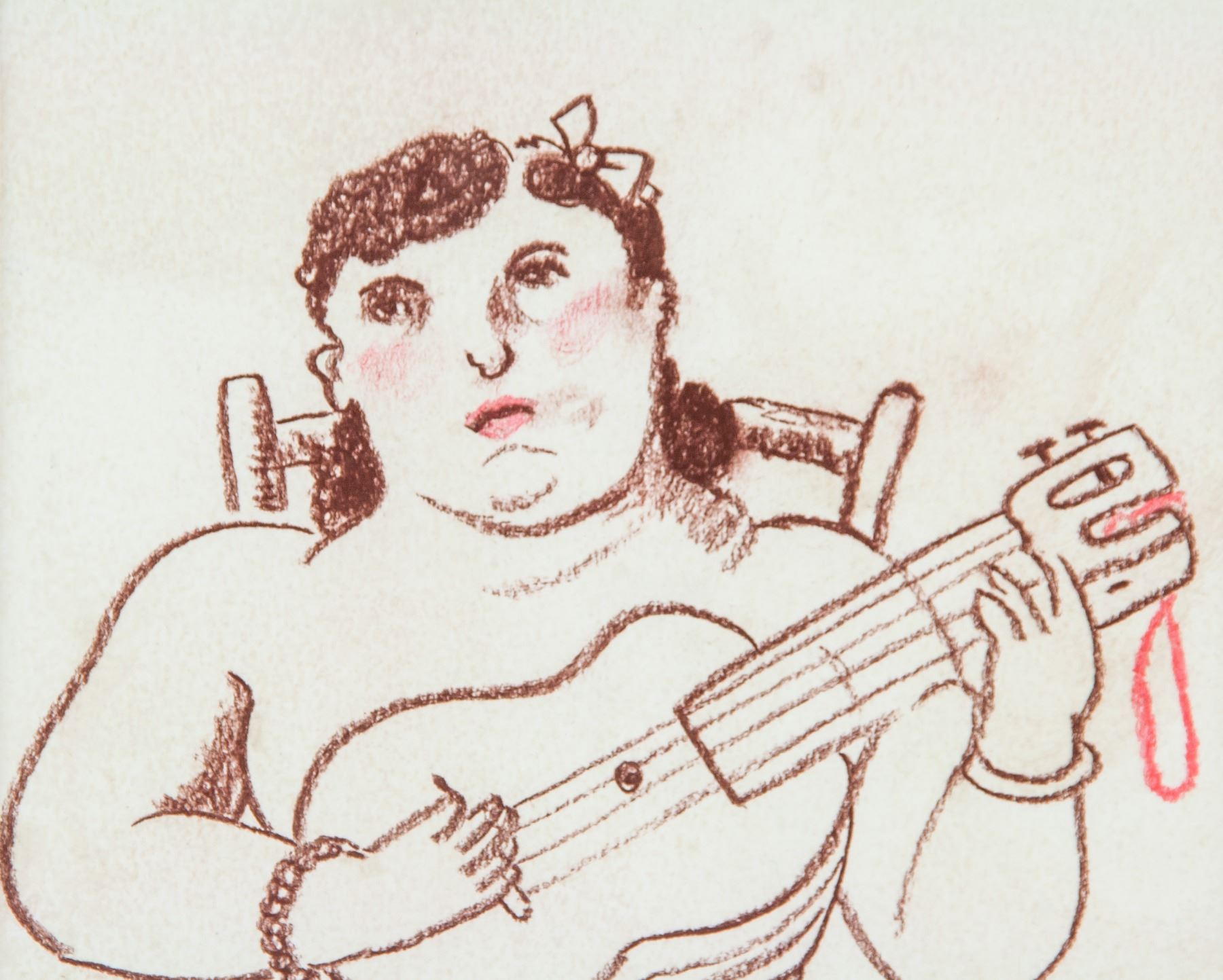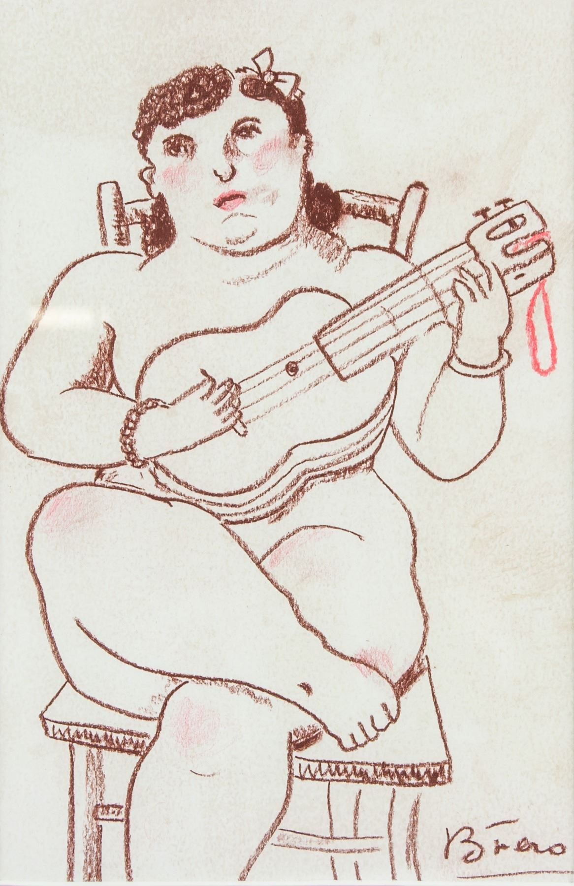 Color pencil on paper. Featuring a rotund female figure playing an four-string guitar. Signed and attr. Fernando Botero (Columbian, b. 1932). 8.7 x 5.9 in. (22 x 15 cm). Drawing inspiration from a diverse array of influences, from Renaissance masters such as Giotto and Paolo Uccello to the 20th-century Abstract Expressionist movement, Fernando Botero’s signature style is characterized by the use of rotund figures and inflated forms. His 1961 work Mona Lisa, Age 12 exemplifies his use of the dynamic brushwork typical of Abstract Expressionism, although used to depict the figure rather than for pure abstraction. In addition to employing techniques from major movements, Botero’s paintings frequently emulate the subject matter and compositions of past masters, his bulbous renderings of these familiar images often interpreted as gestures of irony or caricature. The rounded appearance of Botero’s painted figures is mirrored in his sculptural work, usually fabricated in bronze at a large scale and often displayed in public.