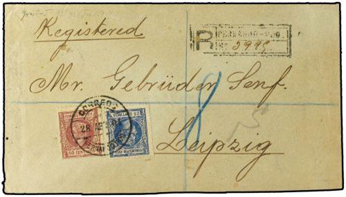 1901 Registered envelope to Leipzig, Germany, franked 25c. + 50c. tied by Correos Fernando Po datestamp.