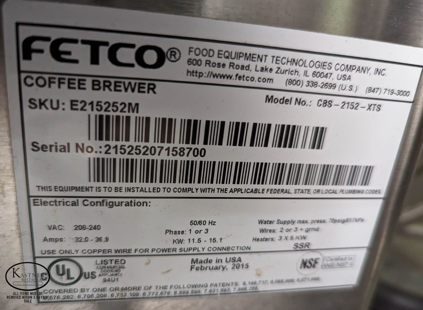 MODEL: CBS-2152-XTS. SINGLE PHASE, 208-240V, 32-36.9A **ALL ITEMS MUST BE REMOVED BY 4:00PM, JULY 21ST, 2023. ALL ITEMS REMAINING AFTER 4:00PM, JULY 21, 2023 WILL BE CONSIDERED FORFEITED WITH NO REFUNDS TO THE BUYER WHATSOEVER. ALL ITEMS IN THIS AUCTION ARE SOLD IN UNTESTED CONDITION, DUE TO THE NATURE OF ONSITE AUCTIONS, WE ARE UNABLE TO TEST ITEMS PRIOR TO THE AUCTION. ABSOLUTELY NO REFUNDS WILL BE CONSIDERED FOR THIS AUCTION UNDER ANY CIRCUMSTANCE. WE RECOMEND TAKING ADVANTAGE OF VIEWING ON JULY 16TH, FROM 10:00AM UNTIL 4:00PM. PICK-UP IS AVAILABLE FROM JULY 18TH, UNTIL JULY 21ST, 10:00AM TO 4:00PM.