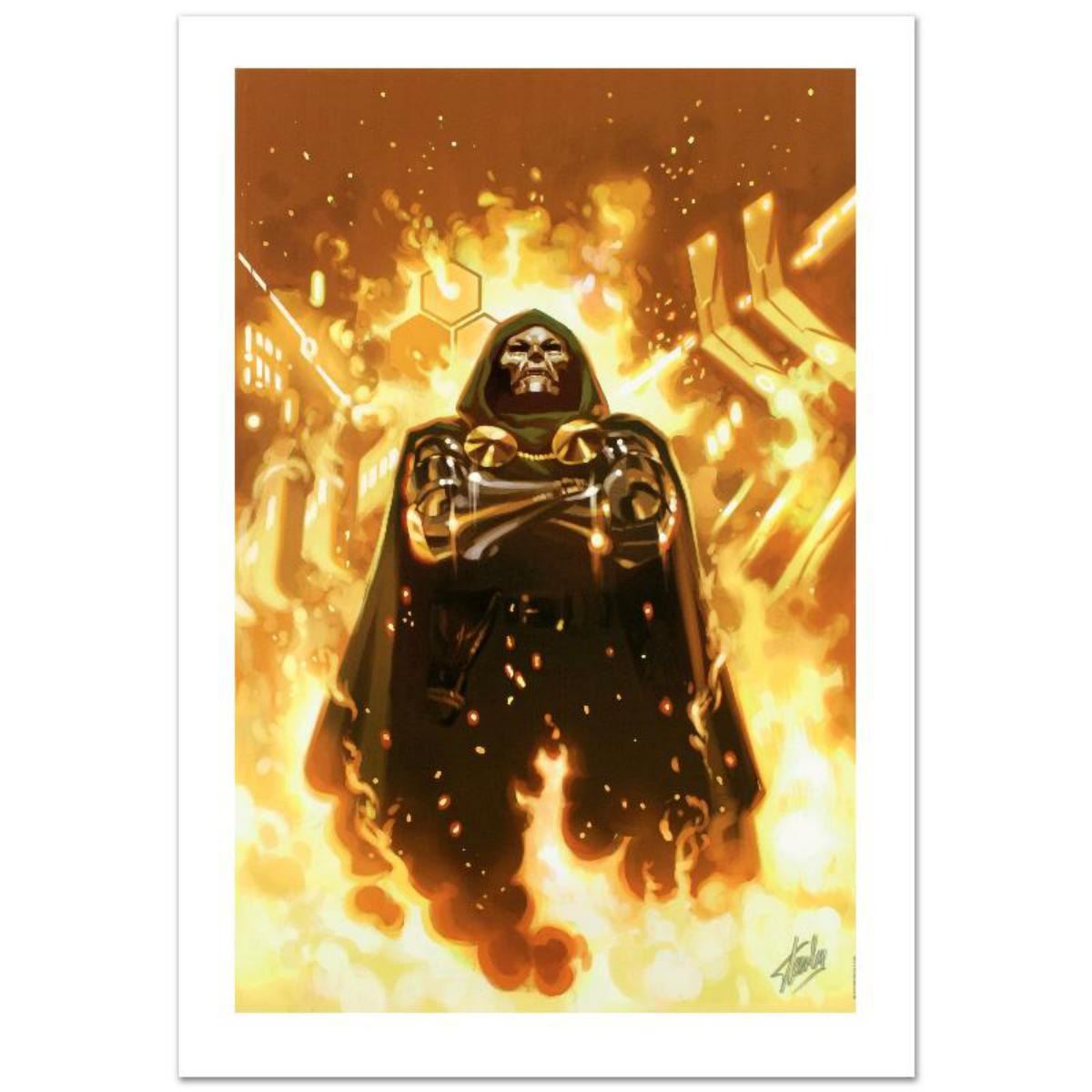 A piece of comic book history, this limited edition, from original art by Daniel Acuna, depicts a Mencaing Dr. Doom. Spanish artist Daniel Acuna cites artists like Jack Kirby and Simon Bisley as his early artist influences. After doing some occasional cover art for Marvel, Acuna signed an exclusive contract with Marvel in 2007. "FF # 2" is a limited edition giclee on canvas by Daniel Acuna presented by Marvel Comics, numbered and hand signed by the Great Stan Lee (1922-2018)! Includes Certificate of Authenticity! Measures approx. 18" x 27" (image). Reference #: 186780.