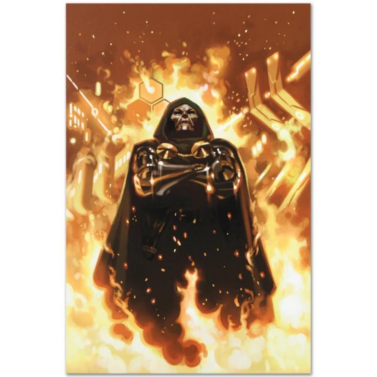 A piece of comic book history, this limited edition, from original art by Daniel Acuna, depicts a Menacing Dr. Doom. Spanish artist Daniel Acuna cites artists like Jack Kirby and Simon Bisley as his early artist influences. After doing some occasional cover art for Marvel, Acuna signed an exclusive contract with Marvel in 2007. "FF # 2" is a limited edition numbered giclee on canvas by Daniel Acuna presented by Marvel Comics. This piece comes gallery wrapped. Includes Certificate of Authenticity! Measures approx. 18" x 27" (image). This item requires special handling and may have a longer than usual turnaround.