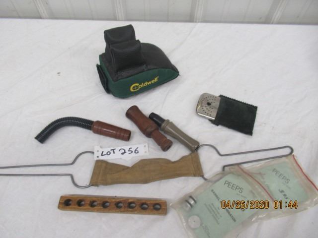 FFF 1) Gun Rest 2) 3 Goose Calls 3) Hand Warmer 4) VIntage Bird Carrier 5) Peeps Barrel Colormanator