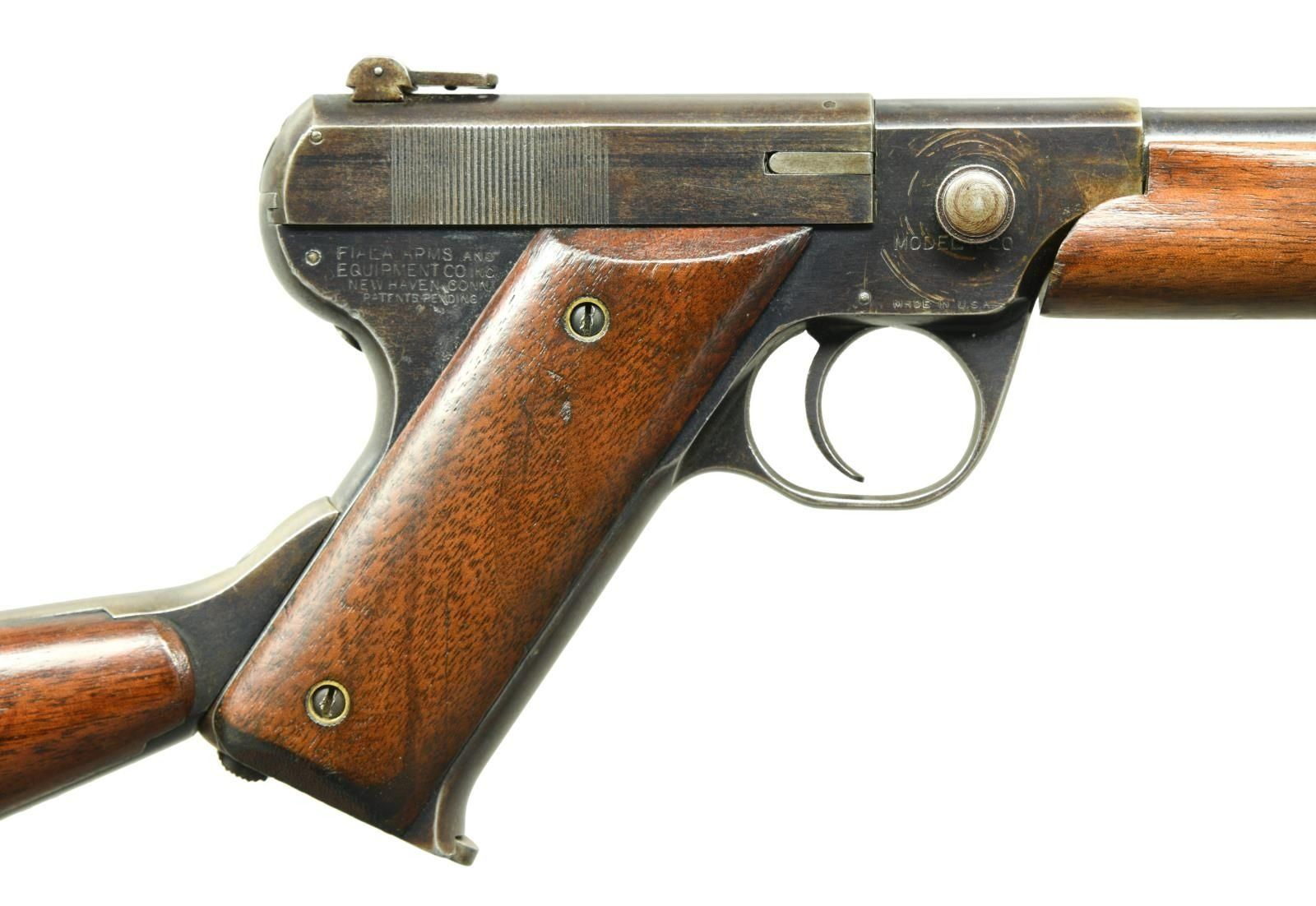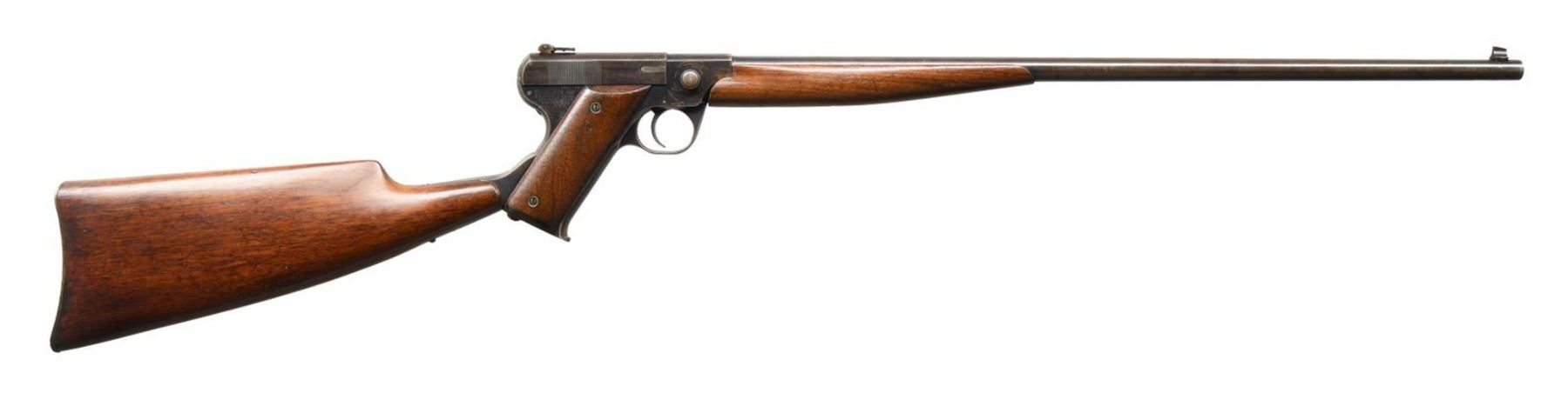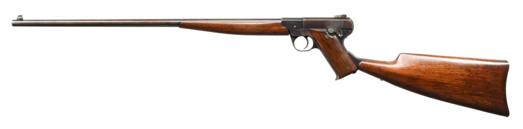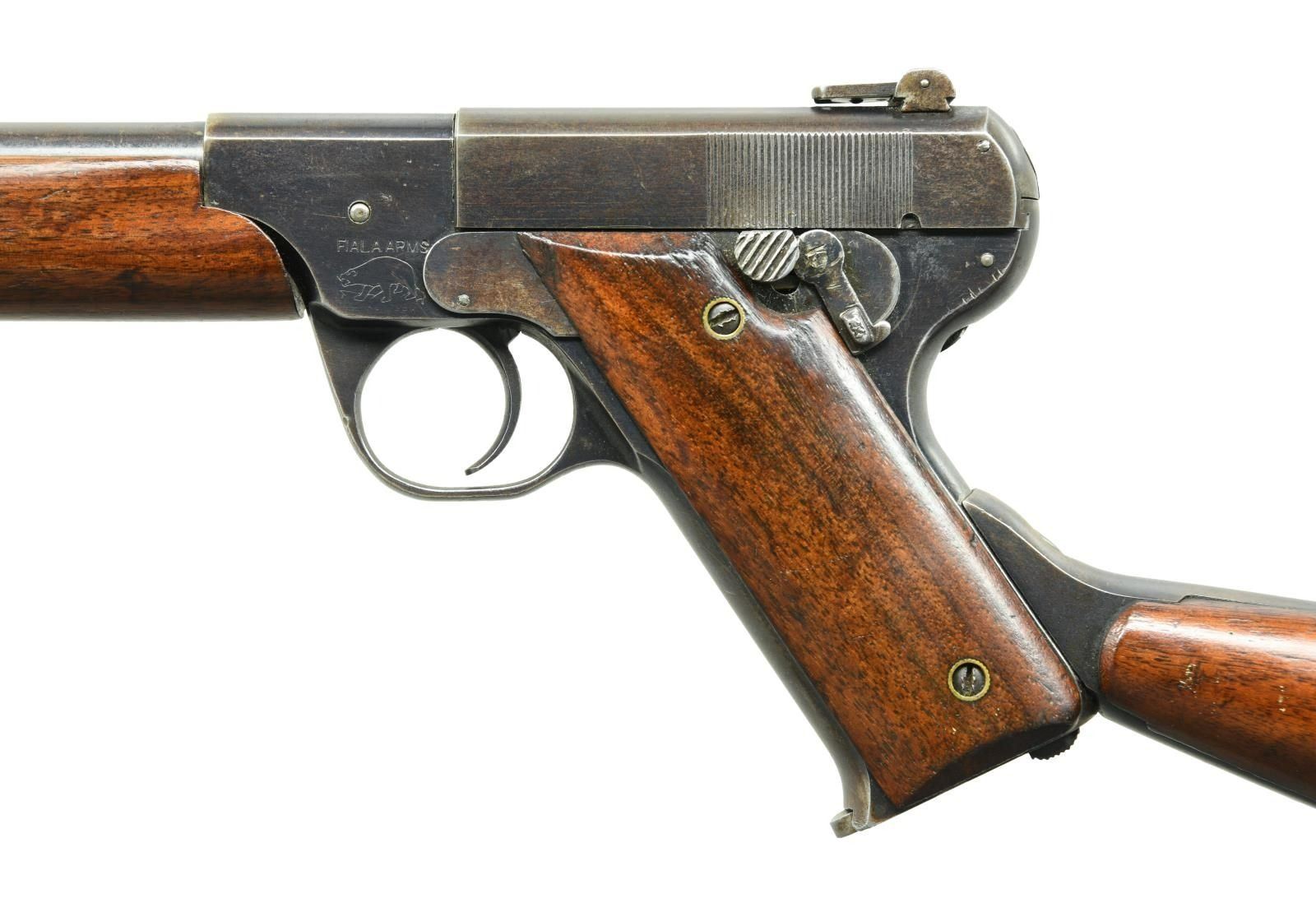 WITH STOCK. Cal. 22 LR. S# 2018. Bbl. 20" with blade front sight and flip up rear. Matching number on slide. Smooth walnut forend, grip panels & matching detachable shoulder stock with curved steel buttplate. Right rear of receiver marked "FIALA ARMS AND / EQUIPMENT CO INC. / NEW HAVEN CONN / PATENT PENDING". Forward right side of frame marked "Model 1920". MAGS: 1-10 rd. CONDITION: metal overall retains 50% thinning blue turning brown with scratches around takedown lug and occasional areas of peppery oxidation. Good wood finish shows scattered light to moderate scratches and dents. Good bore retains sound rifling. (23-1685/BH). CURIO. $1,200-1,800.