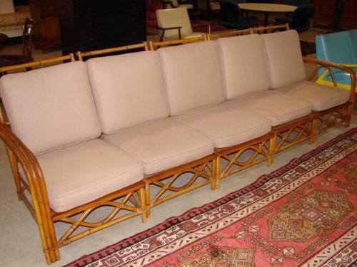 SIX PIECE FICKS REED RATTAN SOFA. 34.5” H to top of back, 9.5’ L, 28.25” D