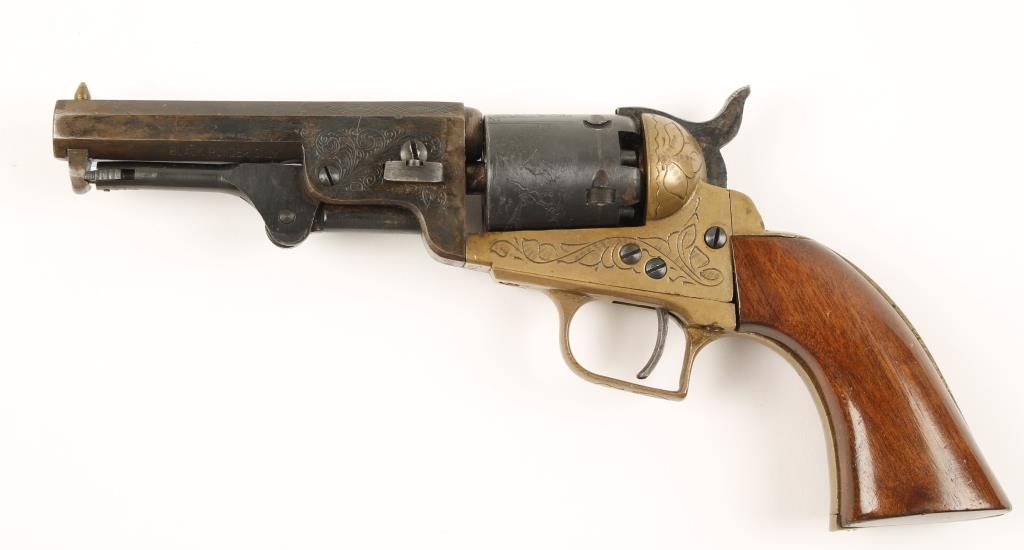 Replica black powder percussion 5-shot pistol. Short frame with engraved cylinder, 4" octagonal barrel and frame and brass square back trigger guard and back strap. Color case hardened hammer and barrel. Has some areas of surface rust. Condition is good. *Antique Firearm*
