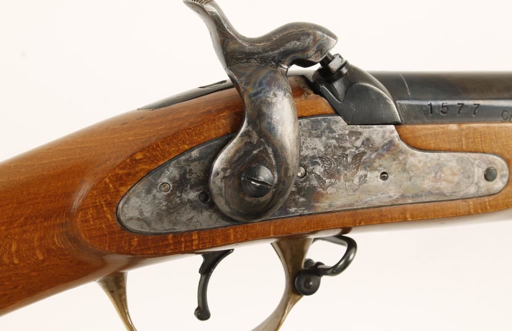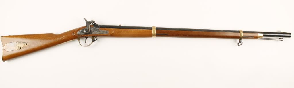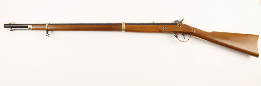 Italian made blued and case-colored steel, brass and wood black powder cap-and-ball rifle with a 32" barrel and ramrod. Bluing on round barrel, sling swivels, screws and trigger is very good with a few small rubs and scrapes. Bore is dusty but shiny with strong rifling. Case-colored lockplate and hammer have light pitting but still show strong colors. Brass sights, barrel bands, forend cap, trigger guard, washers, patch box and buttplate are all tarnished with few scuffs and scratches. Action works well. Two piece wood stock has many rubs , dings and a few scratches. Condition is good to very good. *Antique Firearm*