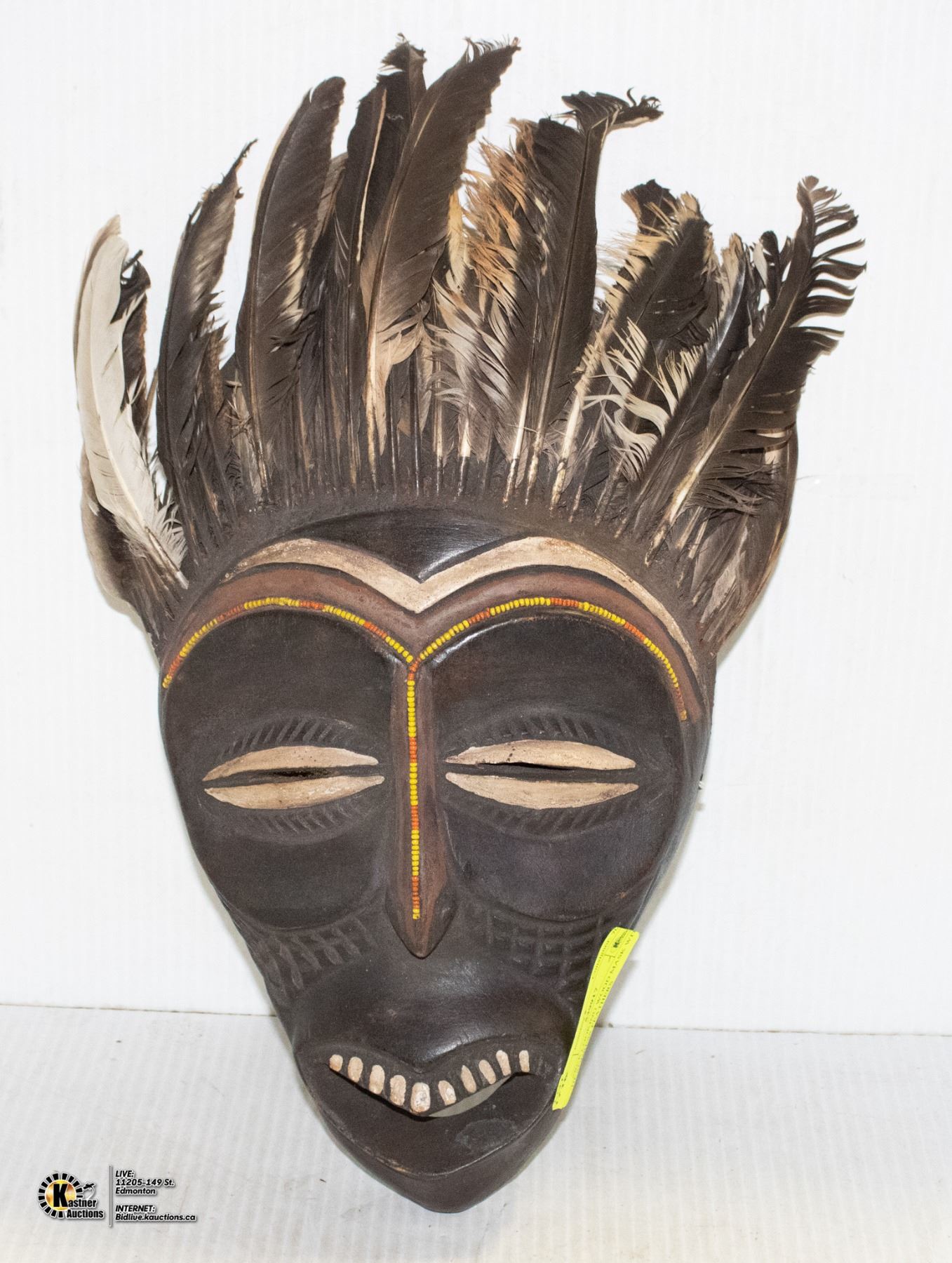 FIERCE LOOKING WOOD MASK WITH HEADDRESS FEATHERS