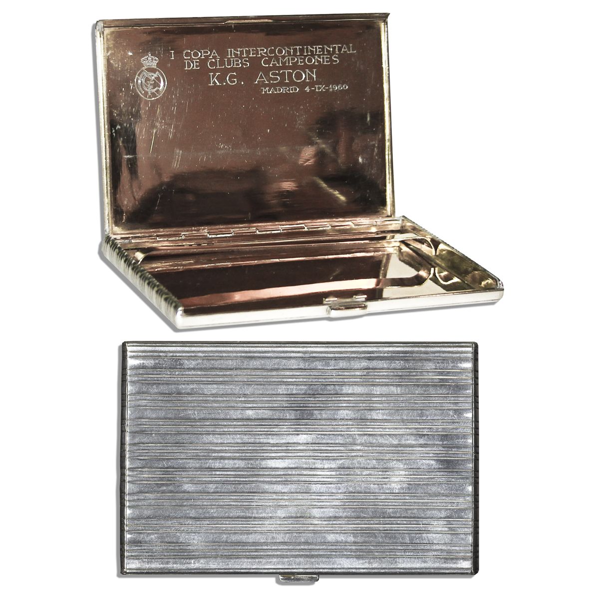 FIFA World Cup cigarette case. Silver plated case was gifted by Real Madrid to referee Ken Aston, for whom the lid interior is engraved, ''I Copa Intercontinental / De Clubs Campeones / K.G. Aston / Madrid 4-IX-1960''. The historic match took place between Real Madrid and Penarol on 4 September 1960. Case features a gilt interior and ridged exterior in a pattern of narrow bands. Measures 4.75'' x 3'' x 0.5''. Weighs 6.25 ounces or 173 grams. Minor tarnishing within grooves, else near fine.