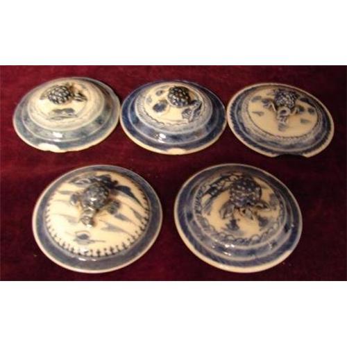 In Image #1 there are five chinese export blue and white syllabub,pot de creme covers in blue and white. Four are Chinese Export Blue Canton and one is Nanking. Image #2 are three Chinese Export Covers. A rose mandarin and 1000 Butterfly covers for a barrell shaped dressing jar and a 18th century famille rose pot de creme.