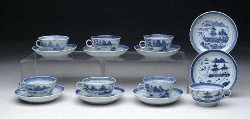 FIFTEEN PIECES OF BLUE AND WHITE CANTON. Lot consists of: Eight 6” saucers/underliners and seven 2-1/4” h handled cups. CONDITION: Generally very good. 9-27634; 27638