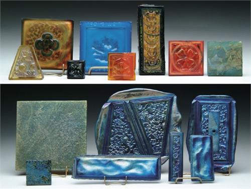 FIFTEEN TIFFANY TILES. Spectacular lot features rich blue and purple iridescent light switch plate still uncut from its original molding, a pair of modified triangular tiles in blue iridescence uncut from their molding, two outstanding blue iridescent turtlebacks in rectangular shape, a lovely blue iridescent tile with floral design molded in center, an outstanding Cypriote tile with green, gold and purple iridescence, spectacular small square tile with rich blue iridescence and a gold lava-type pattern throughout the tile. As well as tiles in red, rich blue, nice iridescent favrile with impressed floral design, one tile is confetti glass, wonderful agate type glass with green four leaf clover as well as a slender tile with dark green mottled glass around the border and an amber mottled impressed mushroom design through center. Some tiles are marked "LCT and Co". Tiles were purchased several years ago at Lillian Nassau. CONDITION: Some minor chips, otherwise very good to excellent. 5-61212, 5-61213