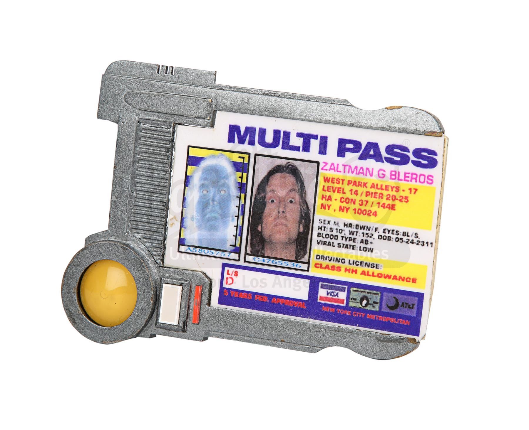 A "Zaltman G. Bleros" Multi Pass from Luc Besson's sci-fi adventure The Fifth Element. Multi Passes were used by characters in the film as a form of identification. Zaltman Bleros was the original name of the character Korben Dallas (Bruce Willis) when Besson originally conceived the story as a teenager. The Multi Pass' photograph is of Nick Dudman, who was the production's creature design supervisor. The Multi Pass itself does not appear in the final cut of the film.