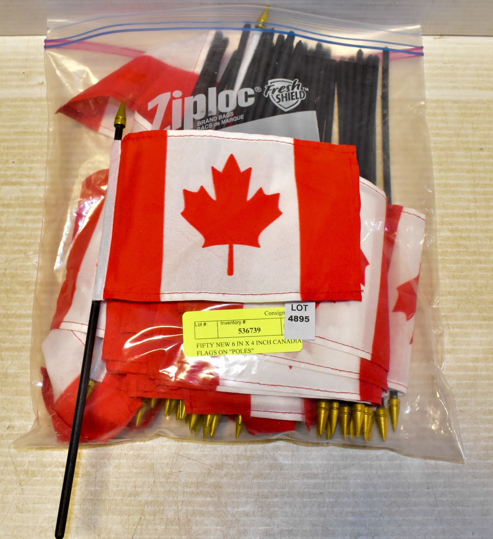FIFTY NEW 6 IN X 4 INCH CANADIAN FLAGS ON "POLES"