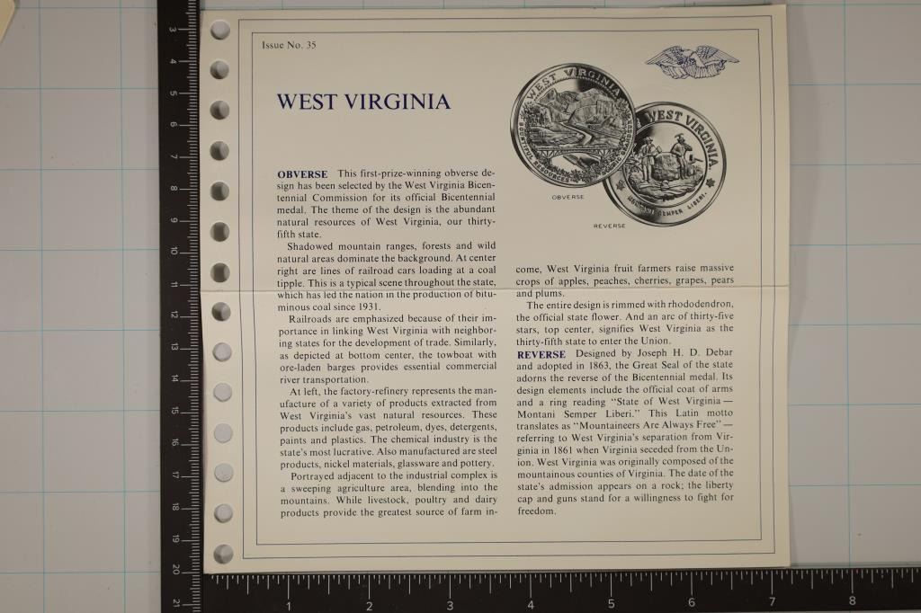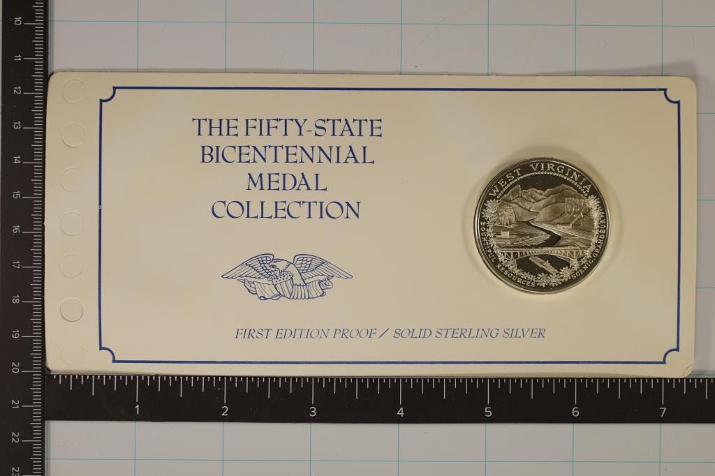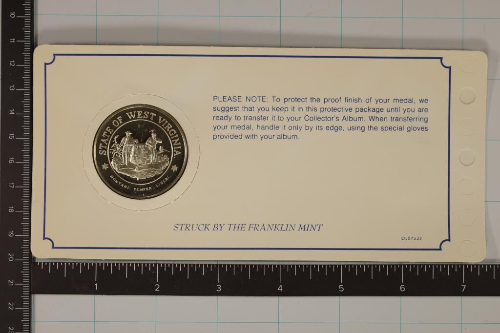 MEDAL "WEST VIRGINIA" IN ORIGINAL FRANKLIN MINT PACKAGING WITH INFORMATIONAL PAPER. 500 GRAINS (APPROX,. 1.04167+ OZ.)