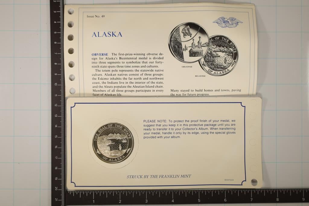 MEDAL "ALASKA" IN ORIGINAL FRANKLIN MINT PACKAGING WITH INFORMATIONAL PAPER. 500 GRAINS (APPROX,. 1.04167+ OZ.)