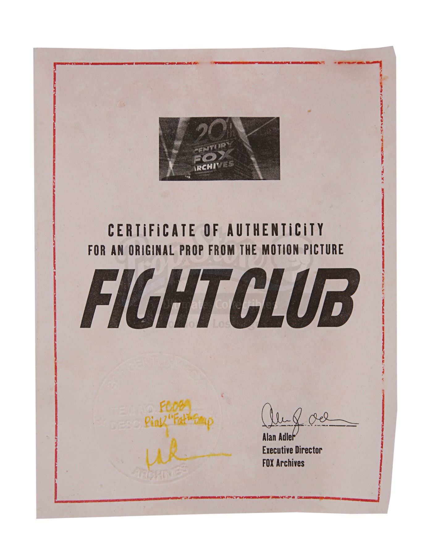 A bar of soap from David Fincher's comedy thriller Fight Club. Soap salesman Tyler Durden (Brad Pitt) showed a briefcase full of soap bars to the Narrator (Edward Norton) when they met on a flight, and the duo later stole human fat from dumpsters at a liposuction clinic in order to make more soap, which was eventually sold to cosmetic store departments.