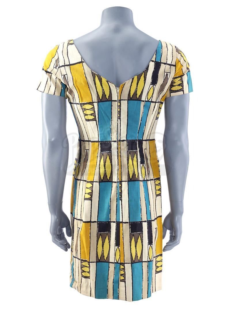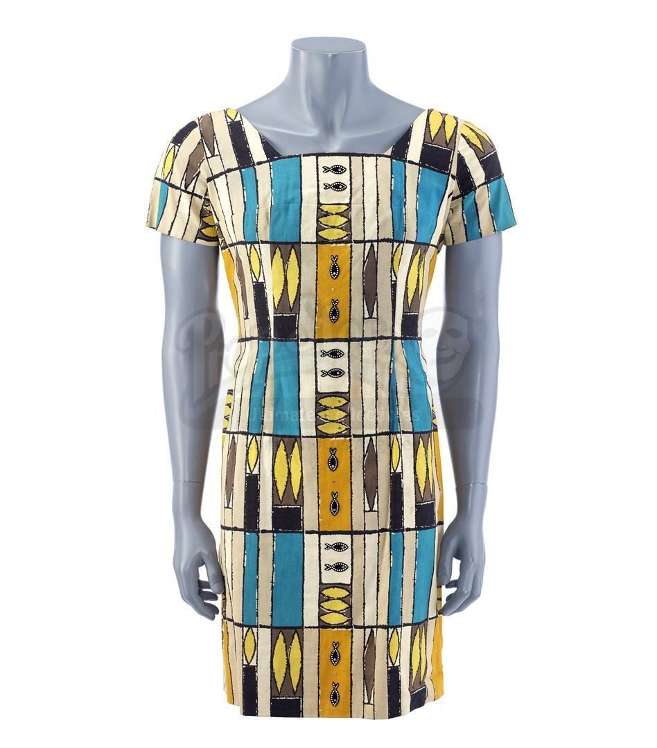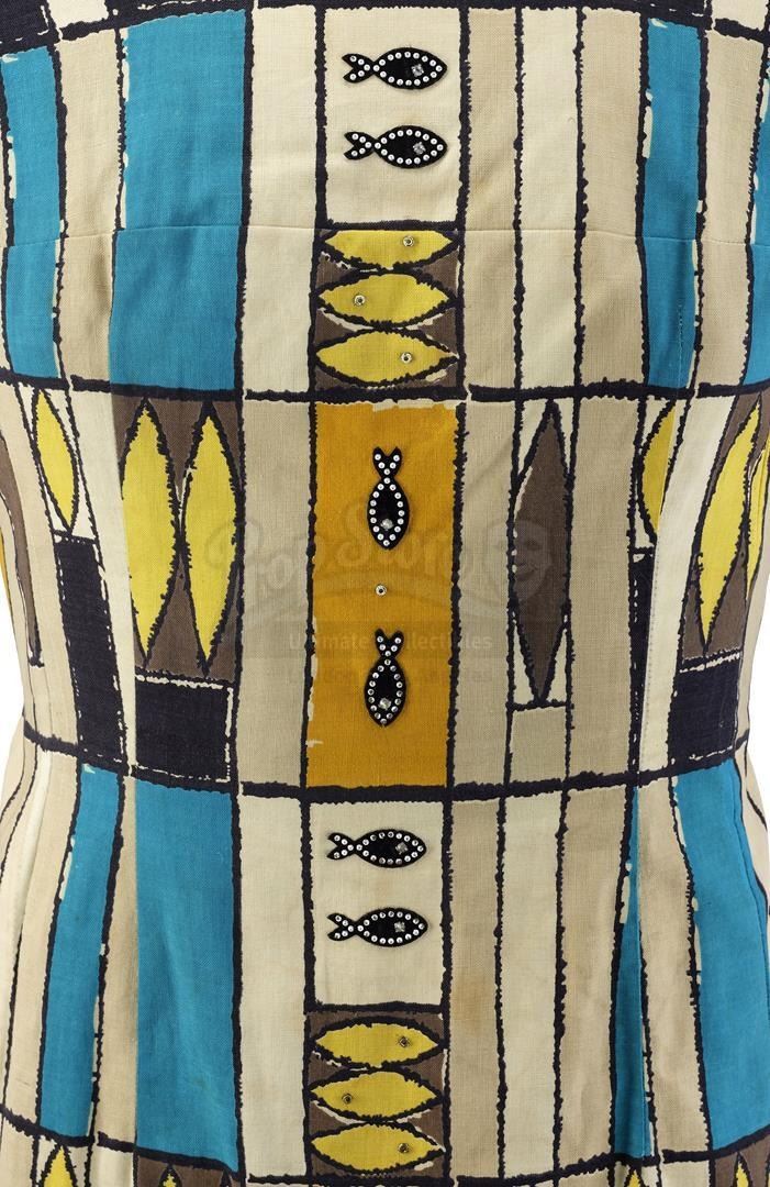 This rectangle-patterned eggshell, turquoise, grey, orange, and yellow polyester blend dress features rectangular patterns, fish-shaped accents affixed with sequins, and a zip closure on the reverse. It is in excellent overall condition with minor signs of wear throughout.