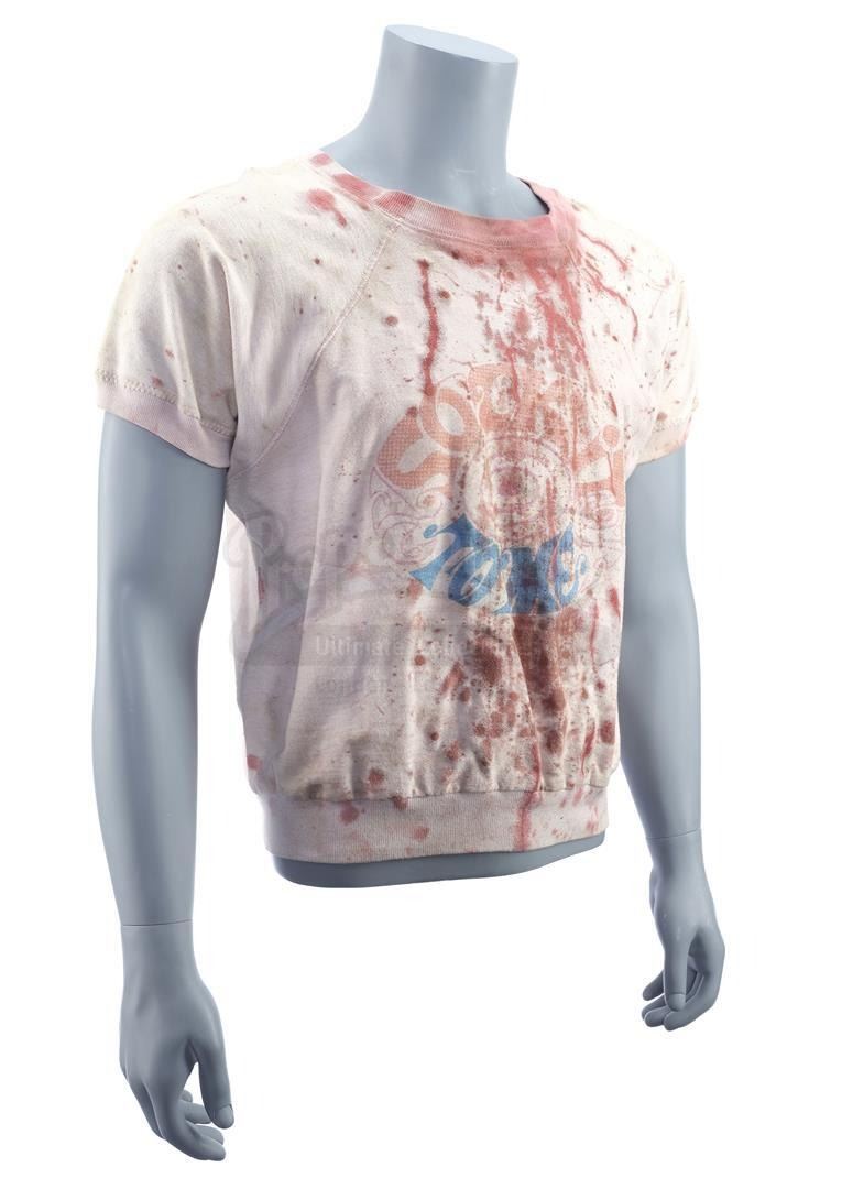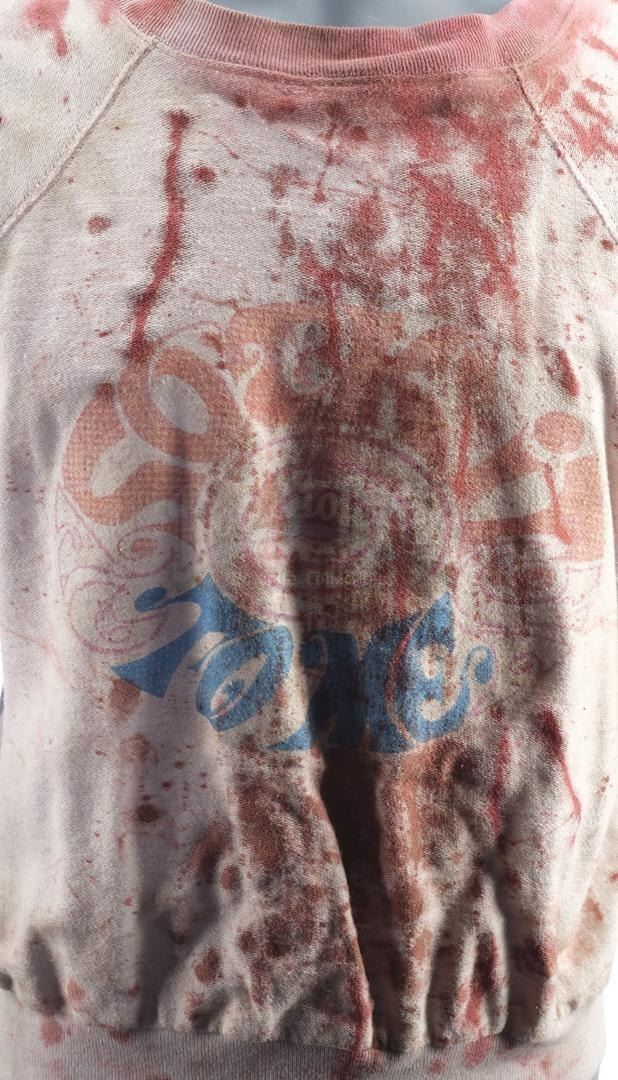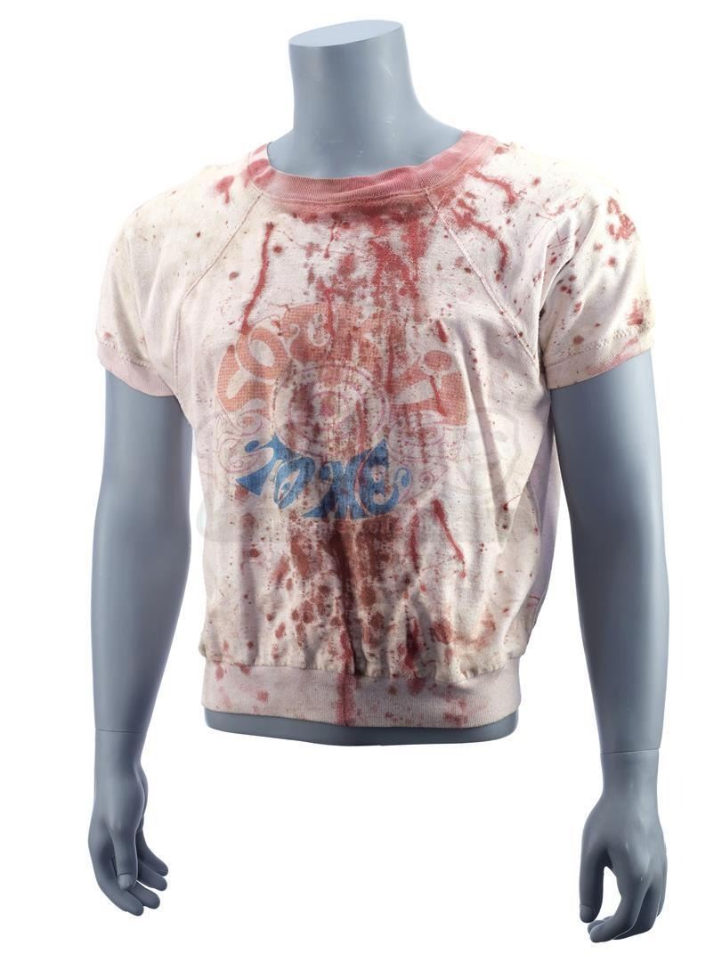 This blood-stained, light beige cotton shirt features a blue and rust-coloured graphic on the chest. It is in excellent overall condition with significant staining from stage blood throughout and some deliberate wear on the stitching from production. A photo print of the screenshot the shirt matches to is included.