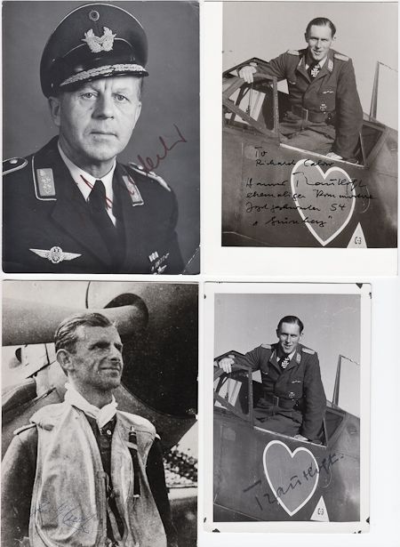 A grouping of eight items by members of the "Grunherz" (Greenheart) fighter group, includes: HANNES TRAUTLOFT, Knights Cross winner with 58 victories, he devised the "Green Heart" emblem of Jagdgeschwader 54, adopting the regional emblem of his birth place in Thuringia ("the great heart of Germany"). Two 3 1/2" x 4 1/2" identical S.P.s showing him in the cockpit of his plane with a green heart painted on it. One is signed "Trautloft" and dated Feb. 2, 1942 on verso, while the other is inscribed: "To Richard Calow Hannes Trautloft former Commander Jagdgeschwader 54, Grunherz"; DIETRICH HRABEK, last commander of the Jagdgeschwader 54 from Oct. 1944 - May 8, 1945, Knights Cross winner with Oak Leaves with over 100 victories. S.P. 4" x 6" b/w, with an A.L.S. transmitting the photo, with holograph envelope; HUGO BROCH, Knights Cross winner with 81 victories, S.P. 3 /2" x 4 1/2" b/w: "Horrido Hugo Broch 6. II. JG 54", with A.L.S. citing the highlights of his career; ERWIN LEYKAUF, ace with 33 victories, S.P. 4" x 6" b/w, with signature on front and A.N.S. on verso: "This picture 1940/41 gunner for air battle above England. JG 26/JG 54/JG3". Along with a post-war candid showing the former ace playing a guitar beneath a propeller mounted to the ceiling of a room, signed on verso: " propeller origin of ME[sserschmitt] 109 F.". The photo shows Leykauf with another ace, noted as: "W[erner] Pichon Kalau v. Hofe former T.O. JG 54". Pichon-Kalau was awarded the Ehrenpokal (Honor Cup), and flew with Mölders. Eight items, very good.