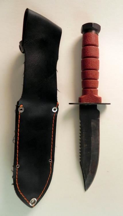 FIGHTING KNIFE & SHEATH--DOUBLE EDGE-SAWTOOTH & SHARP-SHARPENING STONE---5" DARK BLADE