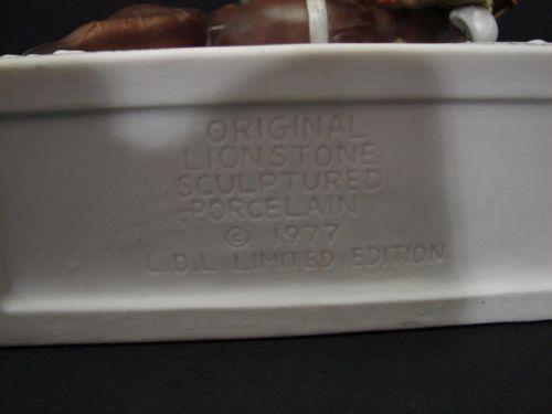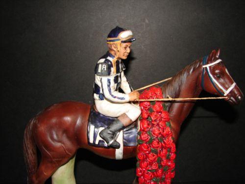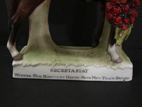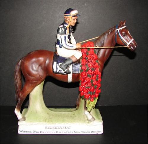 FIGURAL BISQUE SECRETARIAT DECANTER. Depicts Secretariat with jockey after winning Kentucky Derby. Base is marked "Secretariat/Winnter 99th Kentucky Derby-Sets New Track Record/Meadow Stables". Bottom is marked "Original Lion Stone/Sculptured/Porcelain/1977”. 11” H