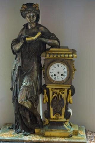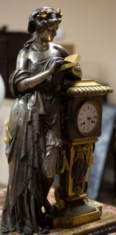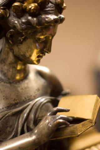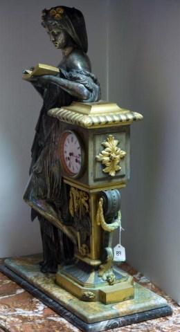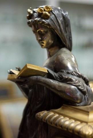 Depicts a woman reading a book. Woman has a silver wash. Has a two tier marble base. 29 1/2" height x 20" width.