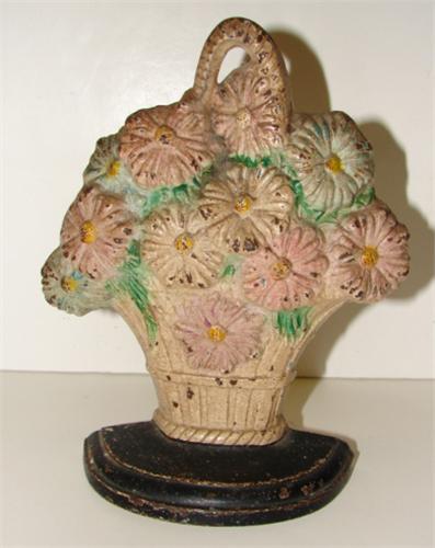 FIGURAL CAST IRON DOOR STOP. In the form of a bouquet of flowers in a white basket. Shows minor wear and loss to paint. Stamped on reverse “344”. 6.75” H