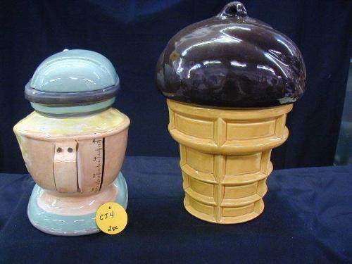 FIGURAL COOKIE JARS (1) 13in ICE CREAM CONE EXCELLENT, (1) 9 1/2in MIXER EXCELLENT, 2 PC