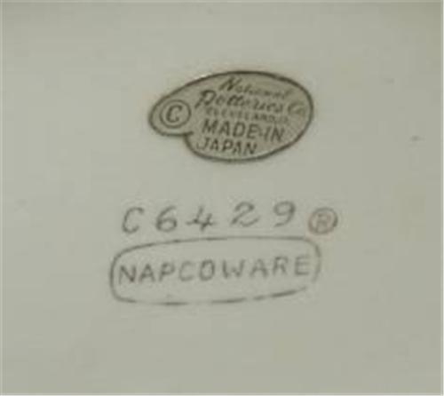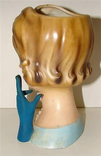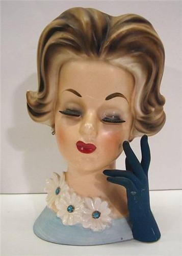 FIGURAL FEMALE HEAD VASE. Female is wearing a turquoise dress with an aqua blue glove on her left hand and has closed eyes. Marked on bottom “Napcoware/C6429” and retains sticker on bottom “National Potteries Co./Cleveland, O./Made in Japan”. 7.25” H