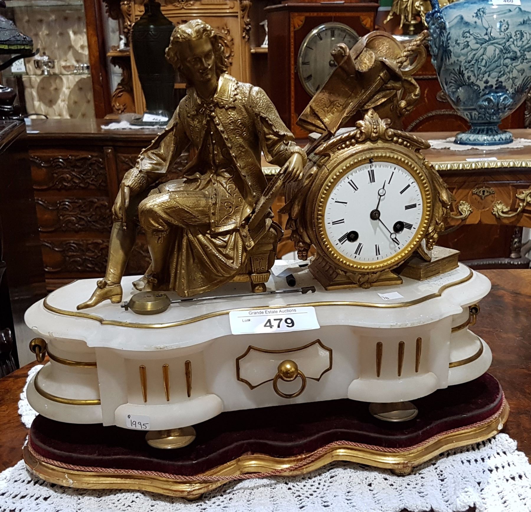 FIGURAL GILT MANTLE CLOCK ON ALABASTER BASE