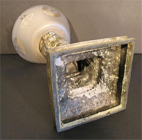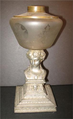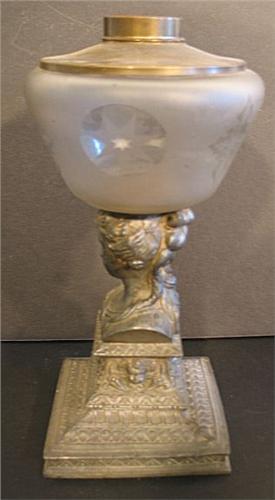 FIGURAL LAMP BASE. Pot metal base has figural bust of female stem. Frosted glass bowl at top. 10.75” H