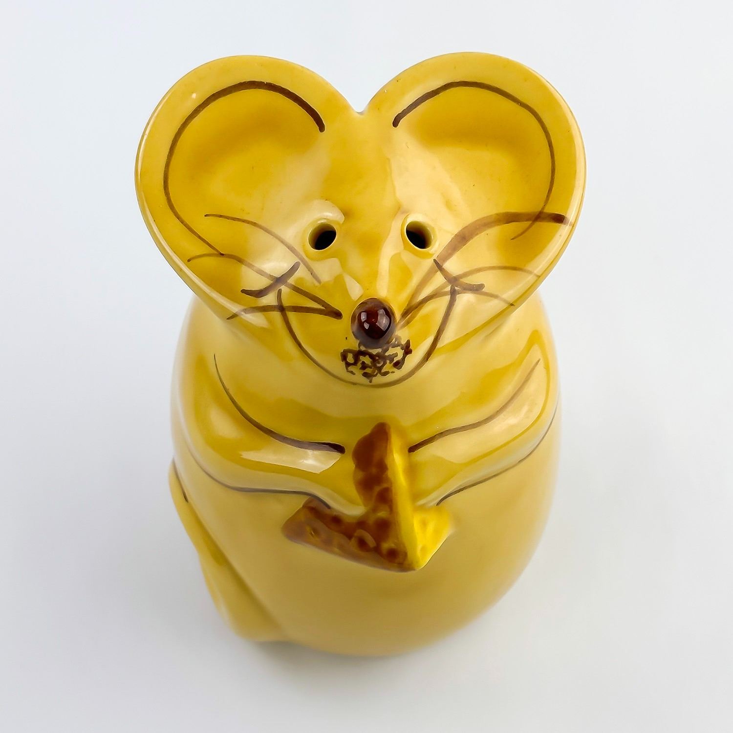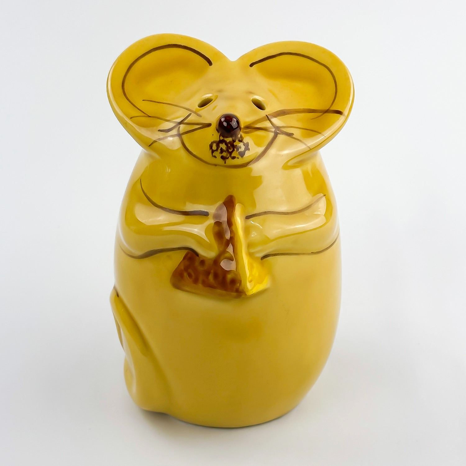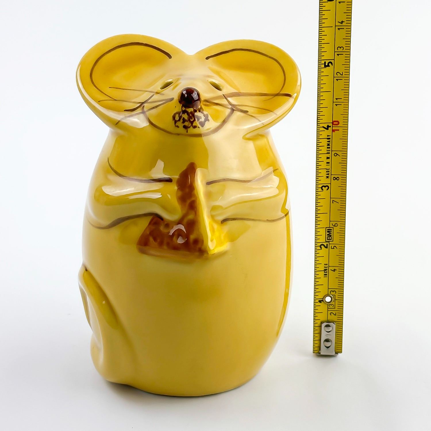 #8346 - VINTAGE LAURIE GATES CERAMIC MOUSE FIGURINE - PARMESAN GRATED CHEESE SHAKER. HOME KITCHENWARE DECOR. YELLOW GOLD COLOR MOUSE WITH CHEESE WEDGE. MEASURES: 5.25” (13.5 CM) TALL BY 3.5” (9 CM) WIDE AND 4” (10 CM) DEEP