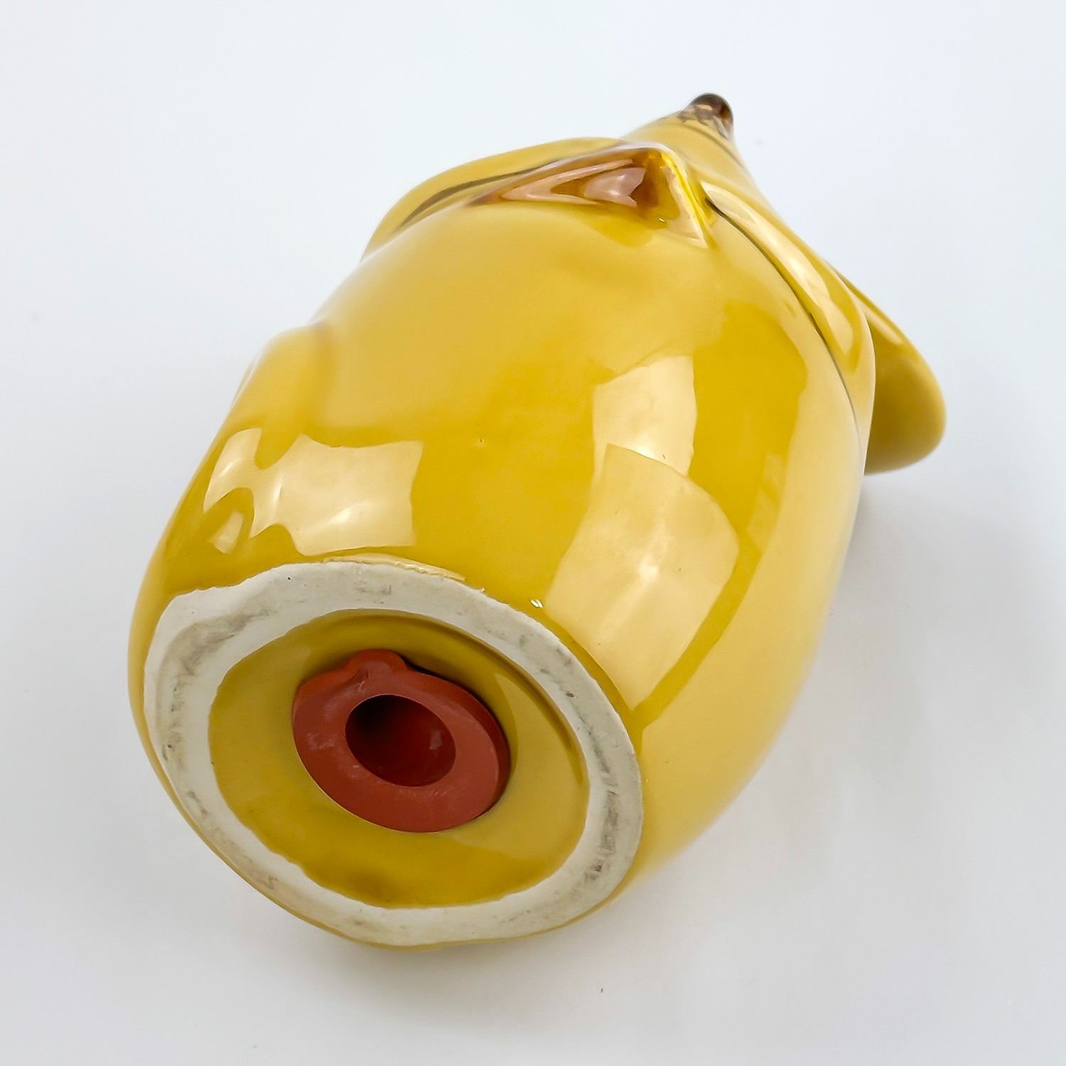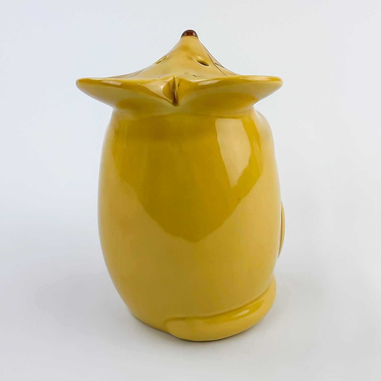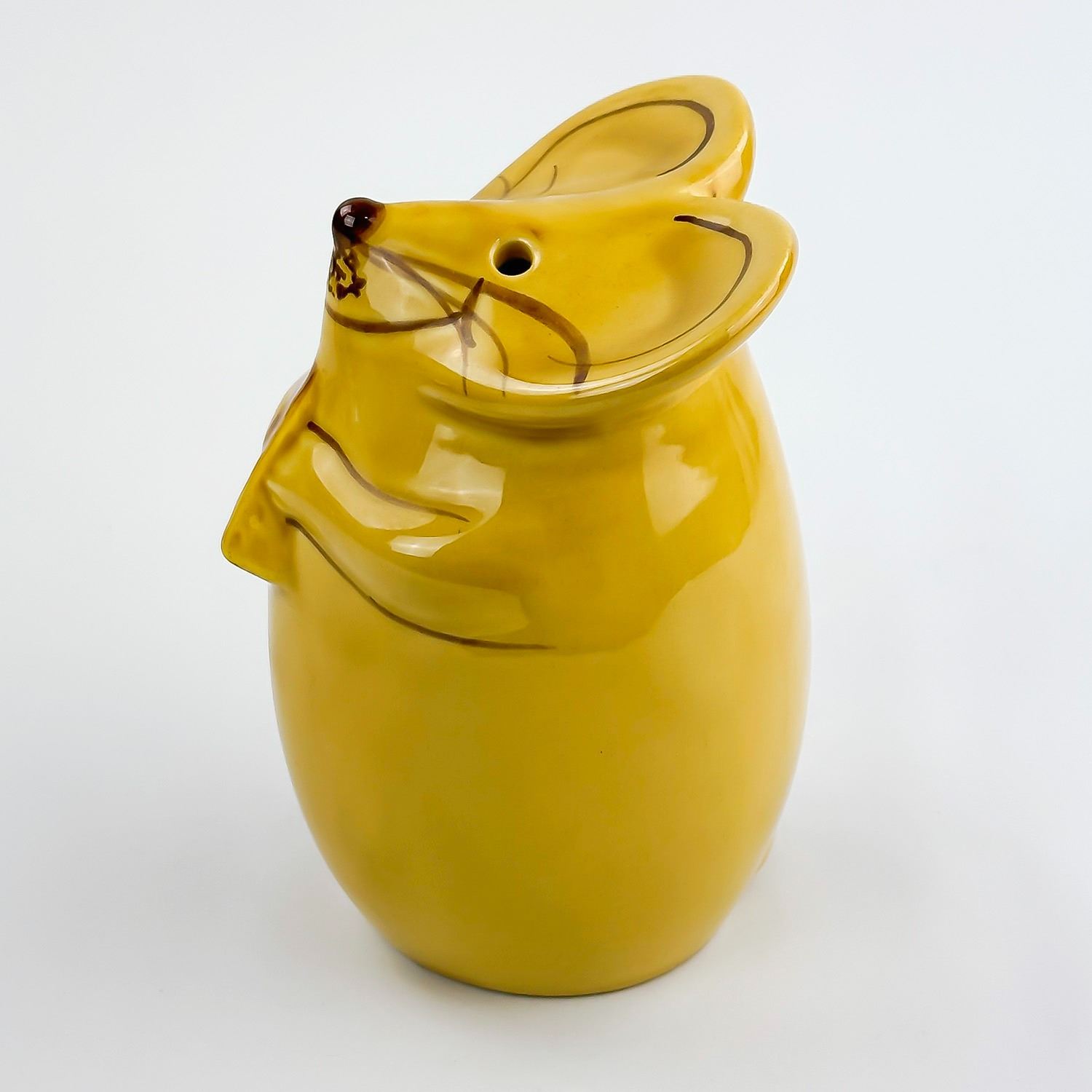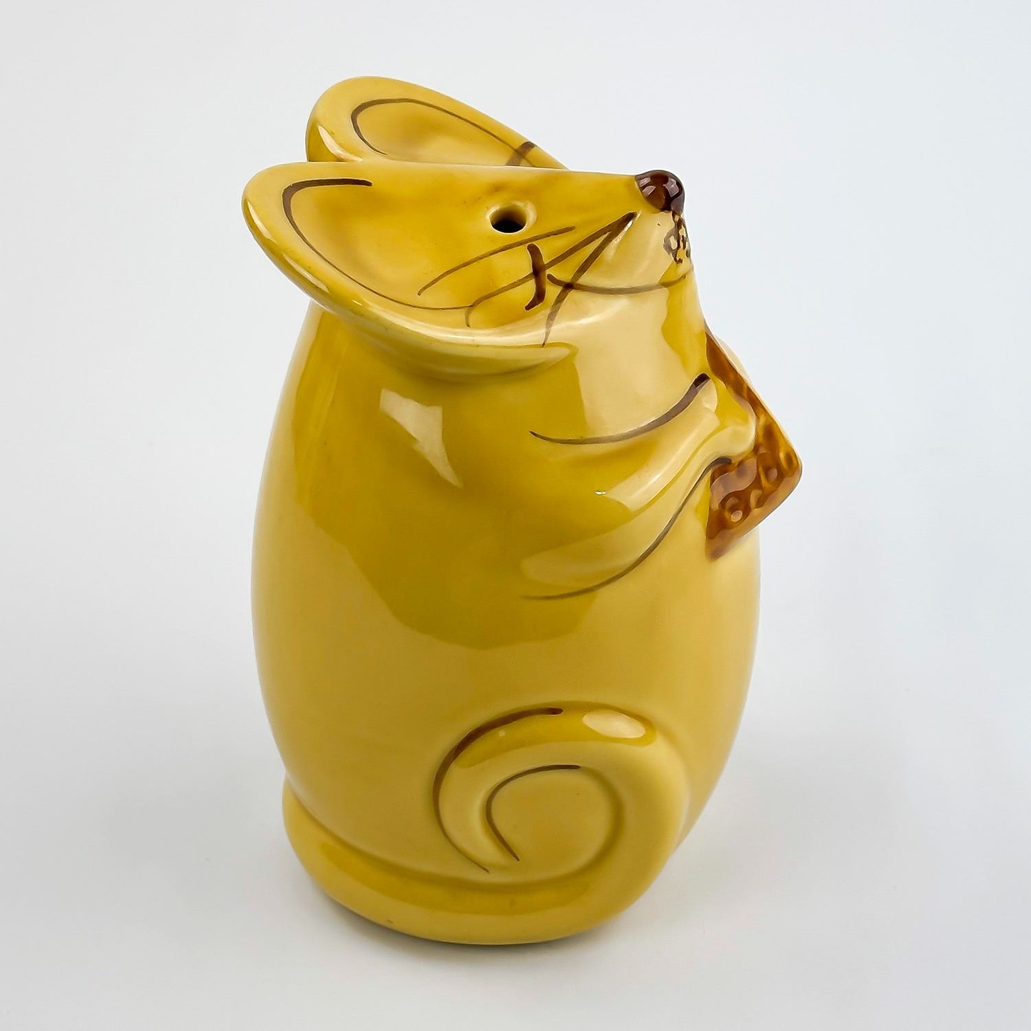 #8346 - VINTAGE LAURIE GATES CERAMIC MOUSE FIGURINE - PARMESAN GRATED CHEESE SHAKER. HOME KITCHENWARE DECOR. YELLOW GOLD COLOR MOUSE WITH CHEESE WEDGE. MEASURES: 5.25” (13.5 CM) TALL BY 3.5” (9 CM) WIDE AND 4” (10 CM) DEEP