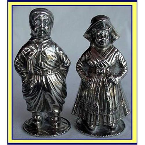 Figural salt and pepper / pepperettes in the form of a Dutch man and woman, made of silver, 19th century.<BR>Weigh 4.oz. Just over 3 1/4inches high.<BR>Each figure stands on a round base with twisted rope edge. Each wears clogs. The woman in long dress and petticoats, held up by broad bands crossing over her back, holds flowers in one hand. High bonnet on her head with removable back , pierced for salt. The boy, books under one arm, also in traditional Dutch costume. His head is hinged at the neck, opening to facilitate filling with spices. Great detail to clothing and faces.<BR>Both pieces are hallmarked and in good condition.