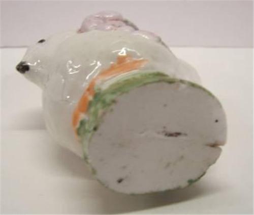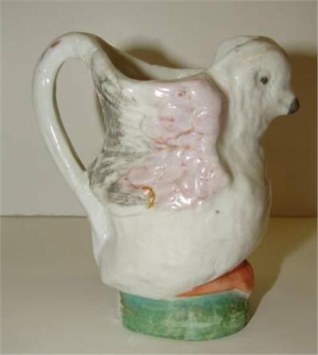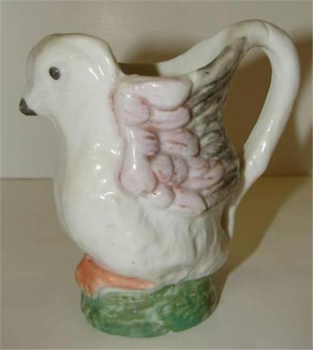 FIGURAL BIRD DECORATED PORCELAIN CREAMER. Has figural bird form body. Shows one small crack at bottom near base. 3.5" H