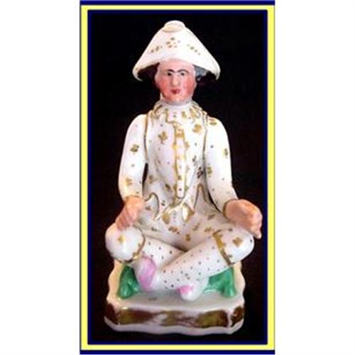 Porcelain sculpture - figural perfume or scent bottle in the form of Pulcinella from the Commedia Dell'Arte. Dates to 19th century, probably French or German.<BR>Measures 4 1/2inches high.<BR>Figure sits on a square base with a wavy border. A green pillow under him. Crossed legged pose. Hand gilded decoration. Humped back and hump in the front. Fine handpainted facial features.<BR>Stopper in the form of the head, which lifts off.<BR>Condition is good.