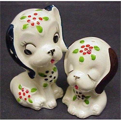 LOVELY HAND PAINTED, SALT AND PEPPER SHAKERS, CUTE PAIR OF DOGS WITH FLOWERS.EXCELLENT CONDITION - STANDS ABOUT 4" AND 3" HIGH.US BUYER TO PAY 7.00 FOR SHIPPING PLUS INSURANCE.THANKS!